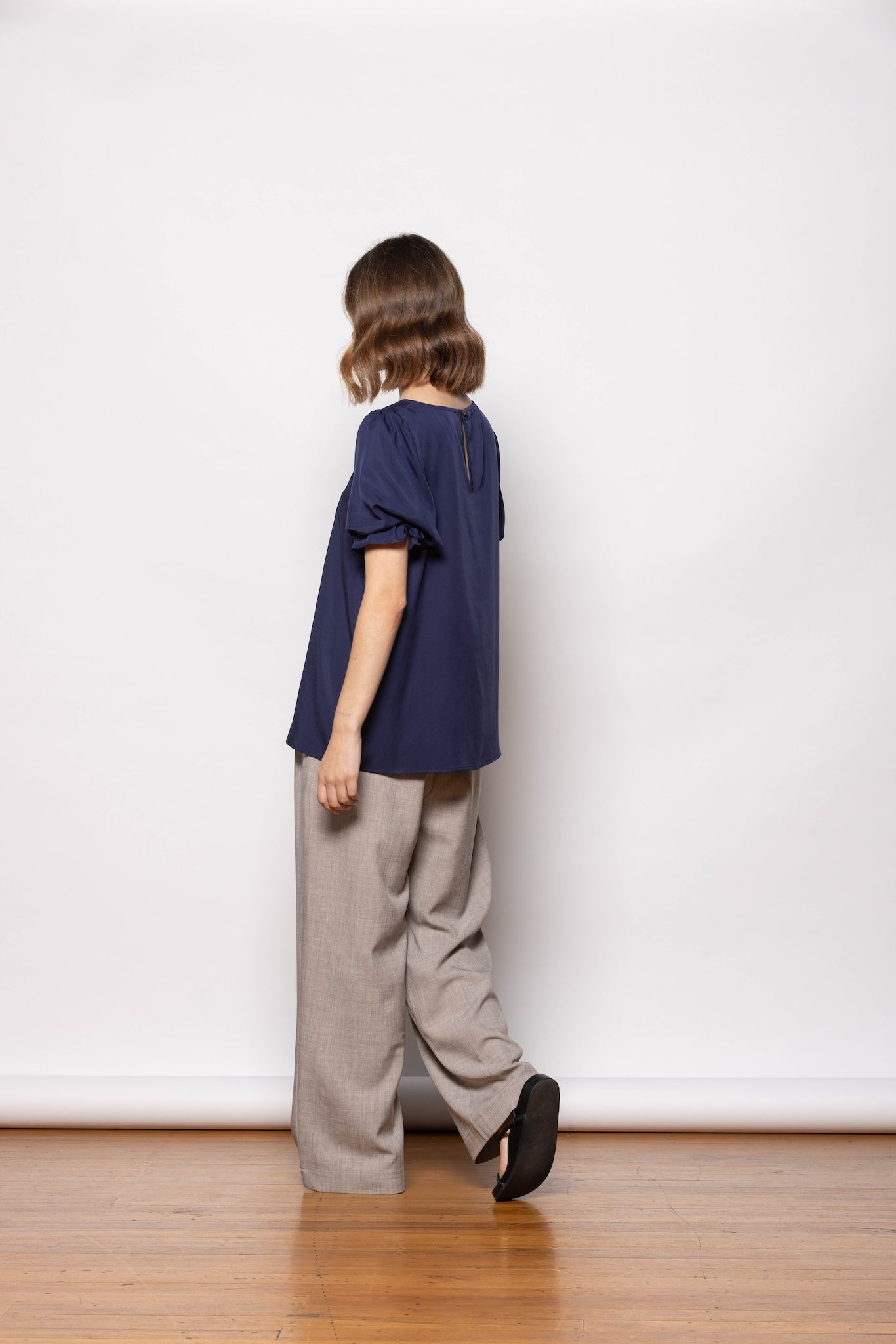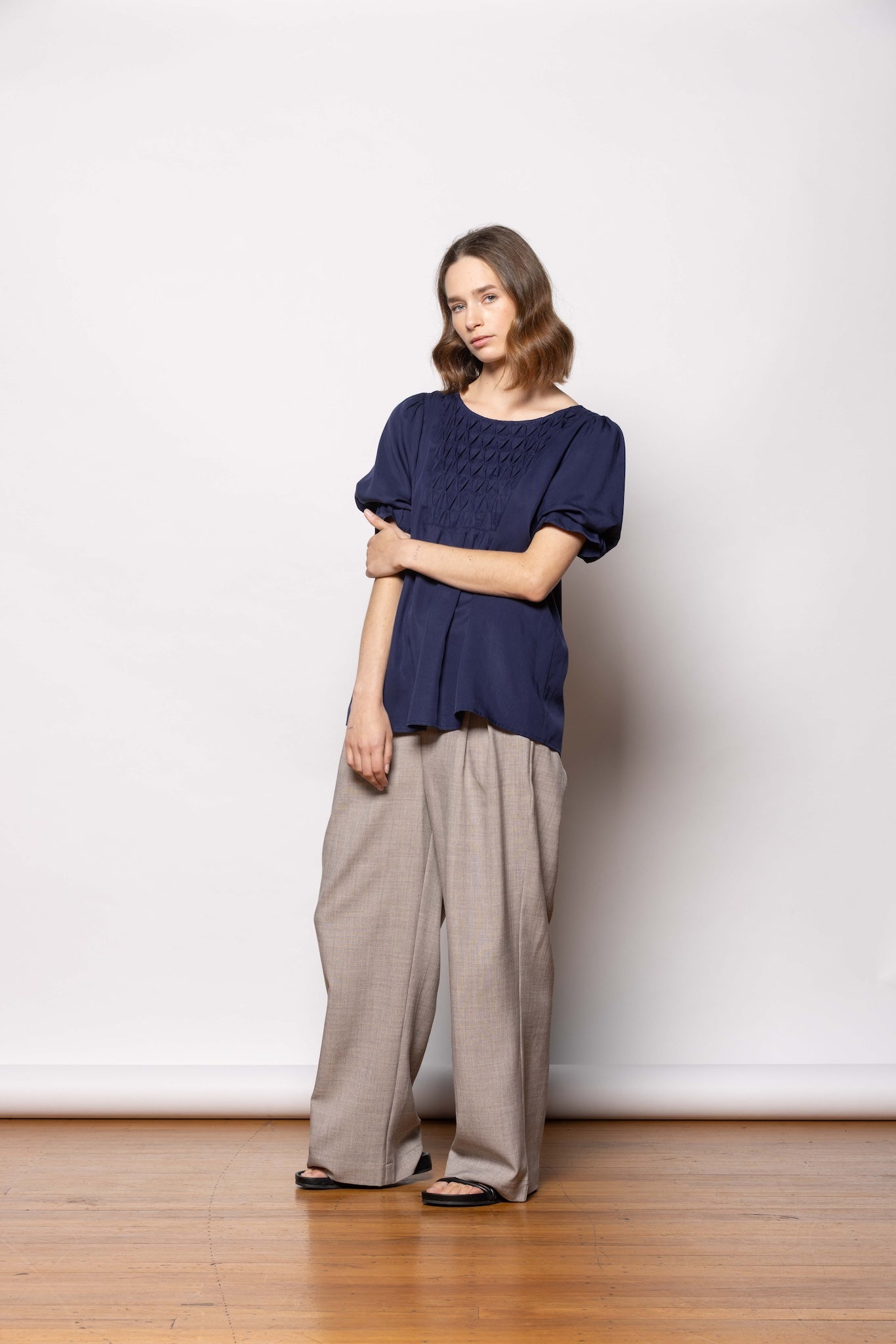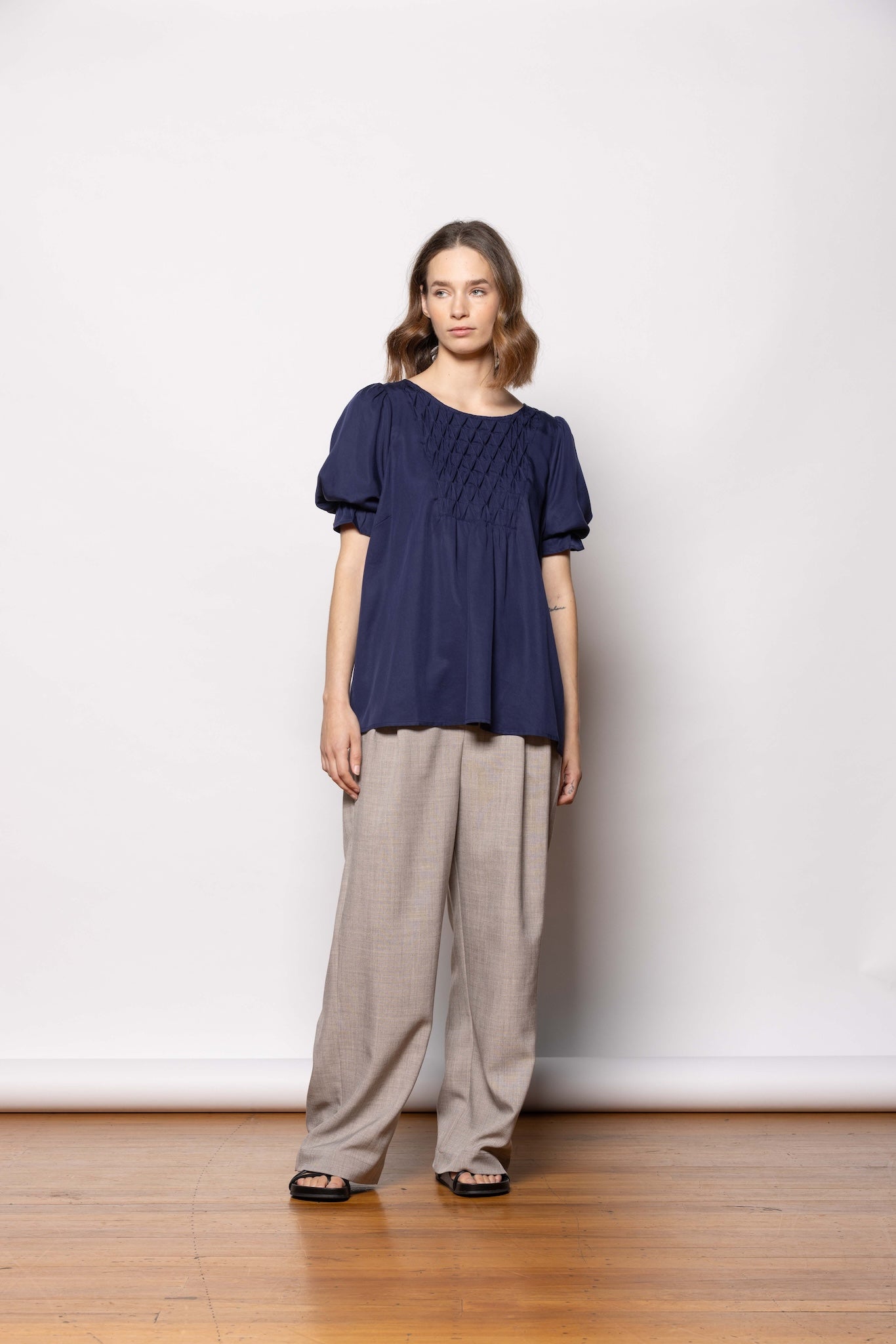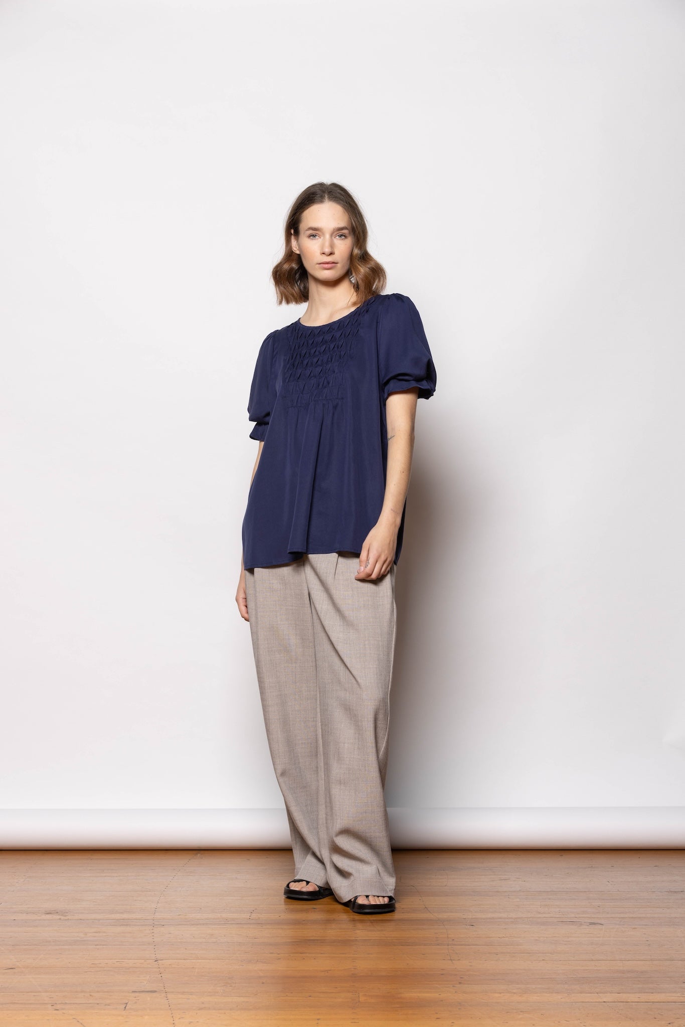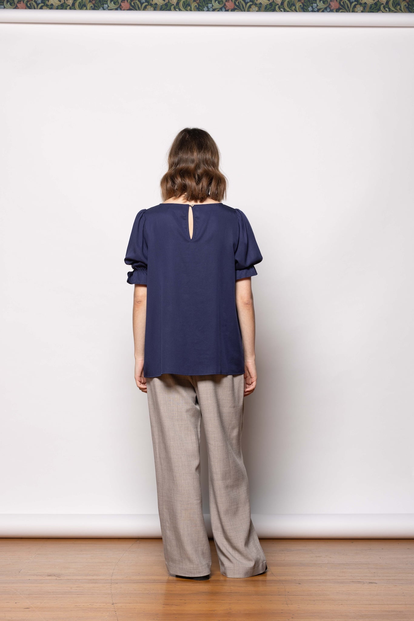 The Market Top in navy features a floaty fit that drapes effortlessly for all-day comfort. Its standout puff sleeves with elastic cuffs add a touch of volume and elegance, while the round neckline ensures a classic silhouette. Delicate chest detailing enhances the design with subtle texture, making this top a versatile choice for both casual and refined looks.